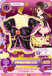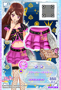 Un top negro con un patrón de Spicy Ageha escrito en púrpura, junto con mariposas doradas. El pecho está forrado en tela púrpura con material de volantes que cuelga de la parte inferior y debajo de la manga, unido a una gema rectangular en un borde dorado. Cadenas de oro cuelgan debajo de la gema con una mariposa dorada en el lado derecho. Cordones de líneas en el hombro de la manga. La usuaria gana collares de cuentas de oro.