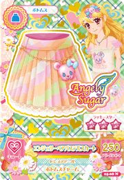 Una falda plisada con franjas diagonales pálidas de color rosa, verde y naranja, y adornos de encaje. Una enagua de encaje sobresale de la parte inferior, mientras que una cadena de oro simple cuelga debajo de la pretina con un encanto de cabeza de Angely Bear.