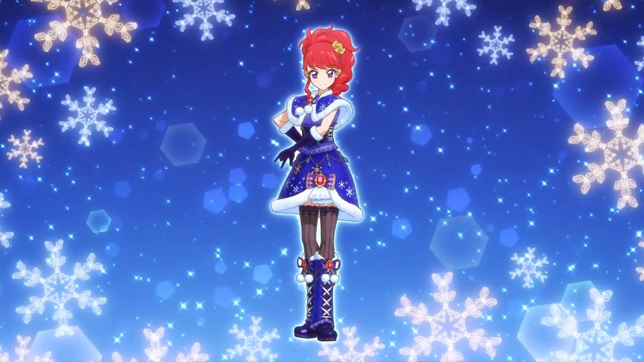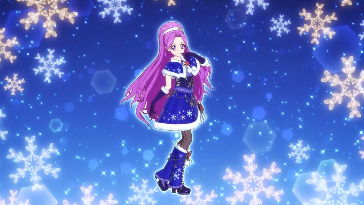 Un corsé añil con el borde inferior recubierto por una tela grisácea semi con volantes con un patrón alrededor de la parte inferior. A cada lado del ombligo hay una tira de encaje azul que rodea un diseño de copo de nieve blanco. A la derecha hay un gran semental plateado con dos cadenas atadas a un lazo azul y dorado revestido en negro, adornado por la misma pieza de plata y un diamante de cristal que cuelga de una esfera dorada. En la esquina posterior del torso hay una cuerda blanca sobre un borde azul. La tela azul agrupada cubre el pecho y sobre este se ve un chal azul con un forro blanco grueso, y esponjoso. Alrededor de la parte inferior hay copos de nieve, estrellas y puntos blancos, los más grandes adornados por una gema de cristal. Cosido al medio es una cinta índigo con pompones grandes y esponjosos cosidos a las colas y una gema granate en el medio de una base de oro. Se incluyen guantes añil largos hasta el codo con un puño blanco esponjoso.