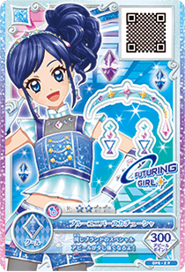 Un corpiño de color azul brillante con forro de borde plateado y una delgada banda de color índigo alrededor de la parte inferior para combinar con las correas de los hombros. En el centro del pecho hay tres juegos de botones dorados conectados por cadenas de cuentas plateadas, la parte inferior y el hombro están adornados con tela con volantes degradados de color azul claro que tiene un forro de color blanco. Cubriendo la clavícula hay una tela gris brillante y debajo del collar hay tres gemas violetas, dos de las cuales son más pequeñas. Se incluyen guantes de color blanco hasta el codo con un brazalete de color índigo forrado en plata para combinar con las pulseras. En el brazo hay un patrón de diamantes de colores violetas, azules y morados.