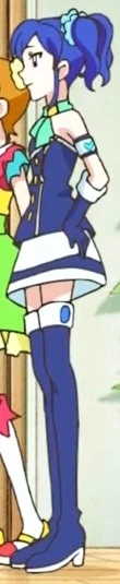 Un top bien formado azul medianoche con detalles blancos y ocho botones dorados. La tela blanca sobresale de la parte inferior con anillos de color azul medianoche alrededor del centro. Se incluyen guantes de color azul medianoche hasta el codo que tienen un acento de puño blanco con un anillo de color azul medianoche y un botón dorado, junto con un tejido degradado azul y lima en el cuello sostenido por un alfiler dorado, y un brazalete blanco y azul en el brazo que tiene un símbolo de color azul claro.