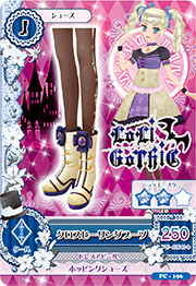 Botas de color beige pálido con forro negro y suela de color púrpura oscuro con tacón puntiagudo. Dos correas de oro, cada una sujeta por dos botones de oro descansan debajo del lazo de cuatro pétalos en la parte superior de la bota. Una gran piedra de color púrpura está cosida al centro. Se incluyen medias marrones, transparentes con un diseño de color beige que se deslizan por el costado de la pierna.