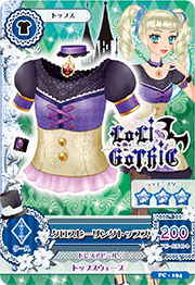 Un top de color beige con una impresión ligeramente más oscura y dos botones dorados cosidos al medio. El pecho es lavanda con un patrón de pata de gallo y forrado en azul oscuro con un borde de volantes blancos. La cinta de color púrpura se cose a través del centro del pecho, mientras que los volantes lilas se cosen alrededor de la parte inferior. La parte superior del pecho y la manga es de encaje gris con un brazalete de color púrpura forrado en oro con una cinta violeta en el lateral. Viene con un brazalete de encaje de color negro, cada uno con una gran piedra púrpura y una gargantilla de color púrpura con volantes de color negro, y un acento de círculo de cuentas doradas por una flor de lis roja.