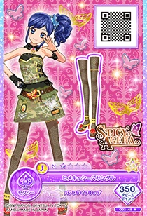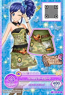 Una falda de camuflaje con un gran diseño de tela de araña y varios alfileres cosidos al lado derecho. En la esquina inferior izquierda hay una etiqueta dorada y negra. Un peplum con volantes reside debajo de la cintura, donde reside un gran cinturón tachonado marrón, adornado con colgantes plateados que cuelgan de una hebilla de oro, y una mariposa roja y dorada. Una cadena de oro descansa sobre el muslo izquierdo con una pequeña gema de diamante rubí.