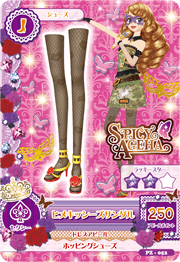 Sandalias rojas con tiras doradas en pie y tobillo. Se cosió una rosa roja a la correa del pie, mientras que los tacos se alinean en las tobilleras. También se incluyen medias de malla que tienen diseños de labios en ellas.