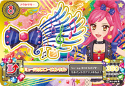 Un lazo de color azul con una franja de color azul oscuro en el medio de cada lado, bordeado de color azul pálido. Tres gemas con forma de diamante granate en cada lado para que coincida con la gema más grande en el medio de una base de oro. Se cose un lazo de color negro más delgado detrás de él. Los aretes de diamantes granate se incluyen con una cadena de perlas doradas con un dije en la parte inferior, uno es una cabeza de gato dorado y el otro una nota musical negra. La usuaria obtiene alas de color azul con forma de barras de música curvilíneas con punta de oro con un pequeño diseño de gema, cubierto de grandes notas musicales de color rosa fuerte, lima, oro y púrpura.