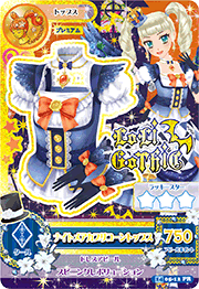 Una blusa blanca con volantes y una cinta de color naranja colgando del centro, donde reside un adorno dorado. La tela de color índigo opaco está cosida sobre ella con una tela azul oscuro brillante como un ala en los hombros para acentuar el forro, las correas de los hombros y la banda debajo del pecho. La parte inferior está forrada en oro para acentuar la tira de botones que baja por el centro, recortar con encaje. La usuaria gana un collar blanco con volantes con un borde de cordón dorado y un pequeño lazo azul oscuro cosido al centro con un adorno dorado en el centro. Una gran gema de rubí sobre una base de oro cuelga del lazo. En cada mano hay un guante degradado de color azul oscuro con un puño de encaje de dos capas con plumas y brillo aplicado. Lazos a juego con la cinta se cosen a las muñecas.