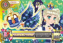 Zapatos blancos con suela plateada y tacón puntiagudo. El dedo del pie es dolor azul oscuro y la tela dorada se envuelve alrededor de la parte superior, sostenida por una cinta de color azul oscuro que tiene una gema de rubí en el medio. El brazalete está en dos capas de pétalos, una azul oscuro con brillo, la secundaria está hecha de encaje negro. Las medias blancas se incluyen con cadenas de color azul oscuro dibujadas en la pierna derecha y escritas en la izquierda.