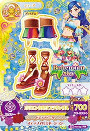 Sandalias de plataforma de color marrón con una suela sólida cubierta de rayas de color oro, azul oscuro, rojo y morado claro. Hay correas de color marrón claro en la punta y el pie, con una flor de color rosa pálido en el centro adornada por una gran esfera dorada y una esfera dorada en cada lado debajo del tobillo. Los colgantes de dorado cuelgan del tobillo, y cosidos en la parte superior hay tiras de cintas de color naranjas y rojas que se conectan a una banda marrón sostenida por un solo botón dorado en el costado. Más arriba en la pierna hay una pieza marrón a juego con tela de pliegues de arco iris debajo. En la parte inferior inferior hay una sola cuenta turquesa con una pluma blanca a dorada colgando de ella.