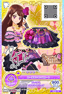 Un top de color lila con encaje negro alrededor de la parte inferior. Las cadenas cuelgan debajo de él y se envuelven alrededor del ombligo, y en el centro del pecho hay una tela de color púrpura debajo de las correas negras, y doradas que tiene un cordón negro cosido a través de él. La tela que hace juego con la parte inferior del torso se envuelve alrededor de la parte superior del pecho, y se cuelga debajo de los hombros, acentuada por dos capas más, una con cuentas de oro y un corte de dos capas negras con volantes. Las correas de gemas doradas y púrpuras residen en cada hombro, y se unen a una cuerda negra atada debajo de la espalda. Cosida al centro del pecho hay una mariposa gema lavanda con detalles en gemas en las alas y un adorno dorado en el centro. La usuaria gana múltiples collares de oro con gemas moradas. Mientras que una mano gana un brazalete de oro y un diseño adornado en la muñeca, la otra gana un guante sin dedos de color gris oscuro y negro con detalles dorados, y una rosa frambuesa cosida.