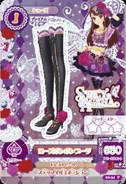 Botas negras, hasta el muslo, con cordones en el centro y forradas en oro. La parte superior tiene un brazalete de color morado claro ondulado forrado en color lila y recortar con encaje negro. Cosido al lado del tobillo es una gran rosa frambuesa con dos cadenas de cuentas que cuelgan de ella al lado opuesto del tobillo, donde reside una gema de frambuesa. Gotitas de oro cuelgan de la segunda cadena.