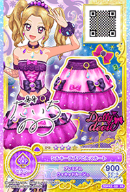 Una camiseta sin mangas de color rosa perla con una delgada línea púrpura bajando a cada lado y un forro de volantes de color púrpura oscuro para acentuar la tira en forma de V en el medio del pecho unida por una cinta de frambuesa. En la parte inferior hay una cinta de seda de color púrpura oscuro adornada con una gema de amatista sobre una base de oro. Alrededor de la parte superior hay vieiras de tul de color púrpura con detalles de color más oscuro y una pequeña cadena de perlas que rodea la parte superior con un lazo de frambuesa en el centro. Desde la parte posterior hay una cadena de perlas de oro que se conecta a una gargantilla de color púrpura oscuro, que está adornada con un solo botón de oro que sostiene una gema de cristal y múltiples cadenas con grandes amatistas en forma de gota. Se incluyen pulseras peludas de color púrpura cubiertas de perlas de oro, gemas y una sola cinta de frambuesa. El brazo derecho también gana una manga de malla con un puño de color morado con volantes.