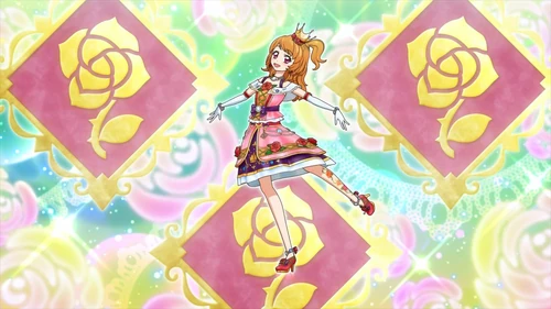 Una blusa de seda rosa con una banda de color naranja en el medio que tiene un borde de color magenta forrado en oro. Subiendo por el centro hay dos hilos verdes tejidos con una rosa de color magenta y una hoja en la parte superior, rodeados por una solapa blanca de tela envuelta alrededor de los hombros con un forro dorado y dos gemas azules y cian cosidas alrededor de la rosa. A los lados del brazo hay un diseño dorado. Las correas de color púrpura oscuro cubren los hombros para que coincida con la cinta atada sobre el ombligo, con una gran gema de color azul claro en el medio de una base de perlas. Las pequeñas perlas están cosidas a la cinta. Se incluye una gargantilla de perlas en capas con una gema a juego, junto con un par de guantes de ópera que tienen brazaletes en la muñeca y una tira de color magenta alrededor de la parte superior, adornada con una flor de durazno. El guante del brazo izquierdo tiene un emblema de Historia debajo del puño.