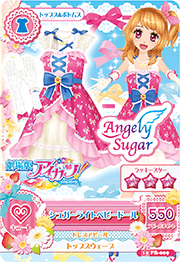 Sugar Light Coord Sugar es un diseño normal de la marca linda Angely Sugar. Debutó como un set promocional y aún no se ha visto en el anime, ¡pero hizo un debut en Aikatsu! La película. Comparte su diseño con Sugar Ribbon Coord y Sugar Moon Coord.
