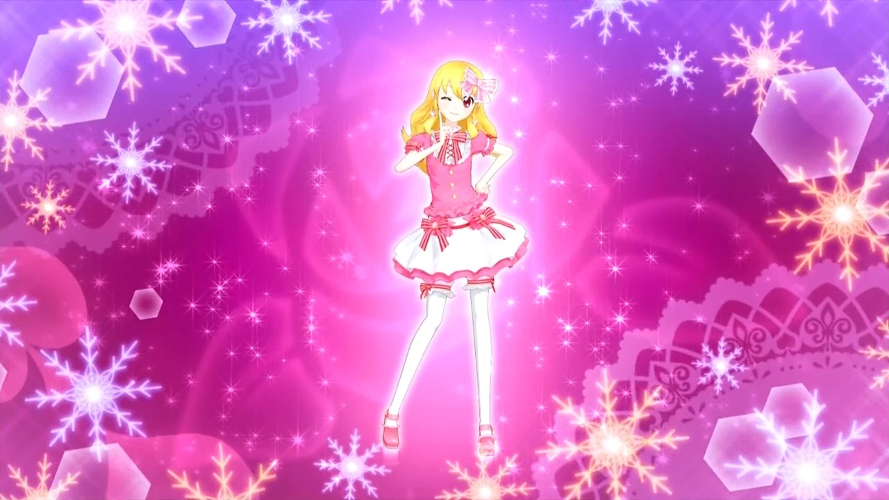 Una blusa de color rosa con encaje cosido a la parte superior de una sección de volantes y una hilera de botones dorados que van hacia el centro. En cada manga hay una correa blanca con una cinta roja y blanca a rayas en el costado, haciendo juego con la que está atada alrededor del cuello. Una joya de color rosa oscuro adorna la cinta del cuello, que reside más de un babero blanco con volantes.