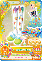Zuecos chartreuse con suela y tacón de cuña de melón. La parte superior tiene una banda gruesa de perla de color azul y blanco en espiral con un pompón de color pastel pálido en el lateral. Los calcetines blancos se incluyen con una parte superior de corte de diamante dividida en dos triángulos, cada esquina tiene una parte superior de color púrpura, verde, azul o naranja con una parte inferior más clara. Las flechas de la parte superior están impresas en cada pierna y Sagittarius está escrito en azul claro en la parte superior del calcetín izquierdo.