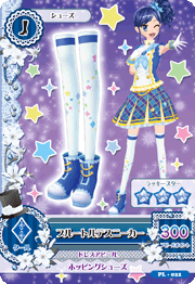 Blue boots with a baby blue sole to accent the baby blue frill lined toe and cuff. The toe is white, and on the front of the book is a pair of gold chains on a baby blue section. The white knee-socks have a pastel star and dot pattern mid-leg. Inches from the top is a blue stripe.