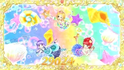 The book appears and opens to reveal the idol sitting within the ocean on a rock as bubbles float around. She floats up and starts swimming with several fish, jelly fish, and a few dolphin surrounding her. She poses after getting high up, surrounded by the same creatures, along with a gold anchor, a white anchor, a gold shell, pearl chains, and a purple star.