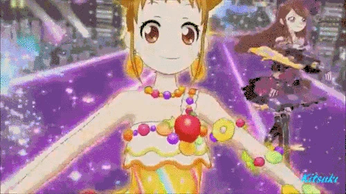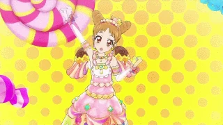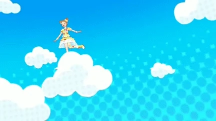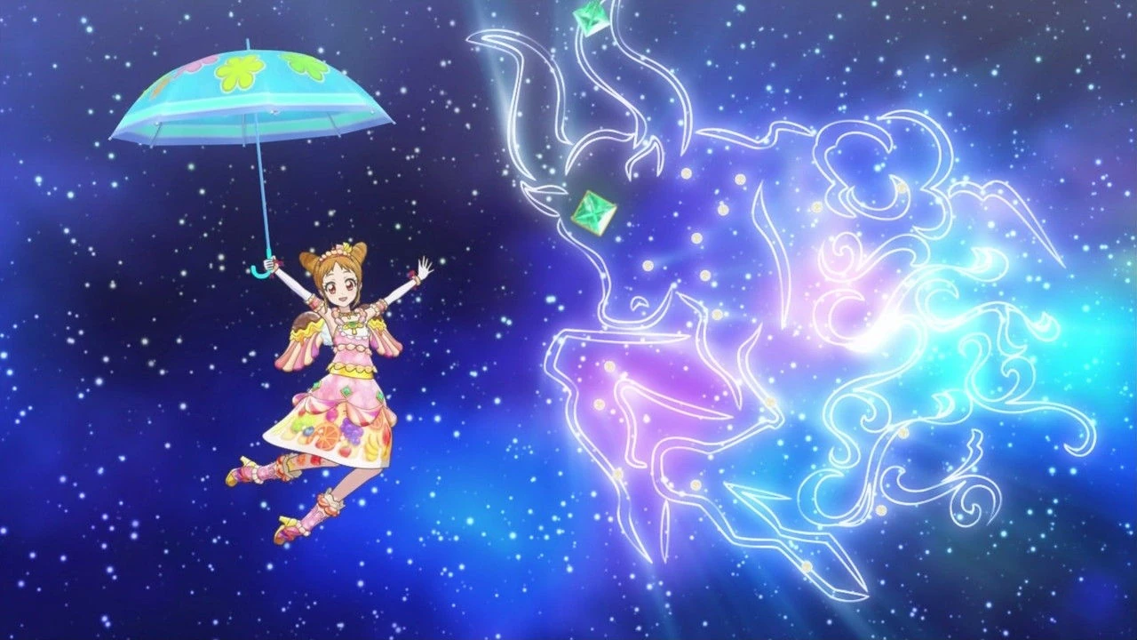 The performer makes a circle which turns into an umbrella and falls while using the blue umbrella like a parashoot. Three rainbows, clouds and candy appear. The umbrella is gold, while Premium gains a sky-blue umbrella. In Constellation, the background changes when she clutches the umbrella and she changes her pose.