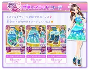 The Bamboo Flower Emerald Coord (竹華エメラルドコーデ Chikuka Emerald Coord)[1] is a rare campaign Romance Story coord, made by the sexy brand Sakurairo Kaden. It debuted in Data Carddass Aikatsu! 2015 Series - Part 3 of the Data Carddass Aikatsu! series.