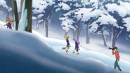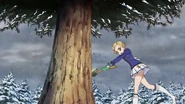 Eventually the girls begin to saw the other side of the tree and send it crashing to the snowy ground, but now they realize they need to get it down the hill- only to see the tree beginning to slide on its own. Akari chases after it and jumps onto the tree, followed by the others and they manage to steer it down the hill; only to make a crash landing and find snow is covering the van. The Director is concerned once more and remarks that the tree is too big to fit in or on the van, but just then the girls are shocked to find Juri's mom, who reveals she came to Angely Mountain to lend them a hand.