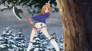 Just then, Akari falls over. She assures the others she's fine though, and she forces herself to stand up and continue until they find the tree in question. The girls express concern for her but Akari insists she can, swinging the axe into the tree. She alternates with Sumire and Hinaki every few swings, and as this is going on Asuka is shown observing them from her home.