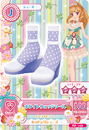 White wedges with ankle straps and a violet platform sole. Pastel purple socks with white frilly cuff and dot print are included.