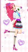 A white shirt with a print of music notes in a rainbow of colors and a split at the bottom to expose the navel. The lining is purple on the torso and black collar, while the purple sleeve cuffs have black lining. On the chest is a purple pocket with chartreuse lining and three crystal square studs, while the lower right of the navel has two colorful rows of gem studs. On the left arm is a black and lime strap with a navy skull on the side. At the neck is a pastel blue tie with purple skull and Rock written under it. The user gains a black bracelet with purple skull, a gold bracelet, and black bracelet with gem studs.