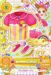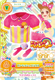 Pinkish Coord (ピンキッシュコーデ) is a rare coord made by the pop Happy Rainbow. It debuted in Part 3 of the Data Carddass Aikatsu! series and did not appear in the anime. It shares its design with the Cotton Color Coord.
