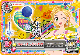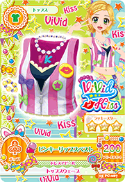 A dark blue low-cut top with frills, worn beneath a zippered white and dark pink striped vest. Decorating the vest are purple and light green bows, and a pair of badges. One is light green with fuchsia star, the other is yellow with red lips. The pearl necklace has tiny purple beads and hot pink and light blue VK hanging from it, and the user gains a bracelet. On the arm are colorful lip tattoos.