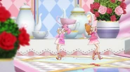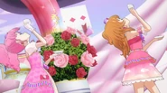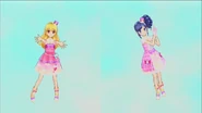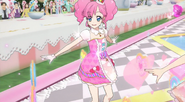 A pink dress with slightly darker heart pattern, the middle has a split going down it lined by white lace. Around the hem is a dark blue and purple striped band with gold detail, a mauve bow on each side with a pom-pom at the center. The fabric going down the middle is a pale pink gradient with faint white print of dots, sparkles and clouds. On the chest are two pastel blue bows above a slightly bigger striped bow with white detail. A gold chain hangs from the bow with a ruby adorned gold diamond. The ruffled petticoat is white, and the fluffy sleeves are pale pink to match the included gloves. The scalloped white collar has a ruby adorned diamond necklace.