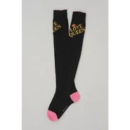 Rose pumps with a yellow flower, worn with black knee-socks that have a crossing, skinny white line pattern.